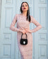 You can never go wrong with a shade of nude during winter time! Elsie dress is the perfect choice from day to night. In this crochet texture and the tight fit of this midi dress is the perfect dress to compliment your silhouette. To give a touch of color you can style it with Rubellite Blazer.