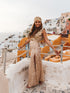 You can never have enough sparkle in your life! This shimmering gold Hermiona maxi dress will give you Greek goddess vibes. It features a high banded waist, a figure-skimming fit, shiny sewn-on gold details, and high side slits. It goes perfectly with a crop top of a matching hue.